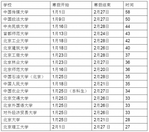 為響應(yīng)教育部號(hào)召,部分學(xué)校已經(jīng)實(shí)行錯(cuò)峰放假。例如:北京。對(duì)比17所在京高校2021年寒假安排(非全部高校)。其中,中國(guó)傳媒大學(xué)寒假時(shí)間最長(zhǎng),1月1日開(kāi)始放寒假,假期長(zhǎng)達(dá)58天;北京理工大學(xué)寒假僅27天。